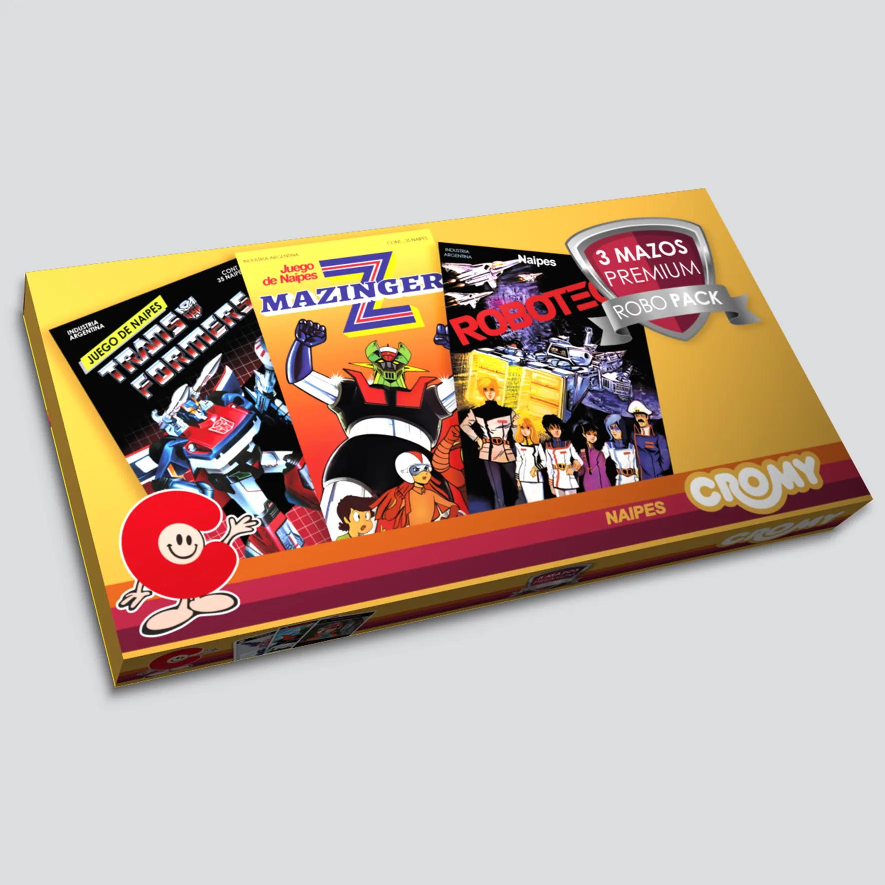 Todo ese legado se concentra en un único pack triple coleccionable, compuesto por tres mazos distintos que recorren la evolución del animé y la animación robótica.